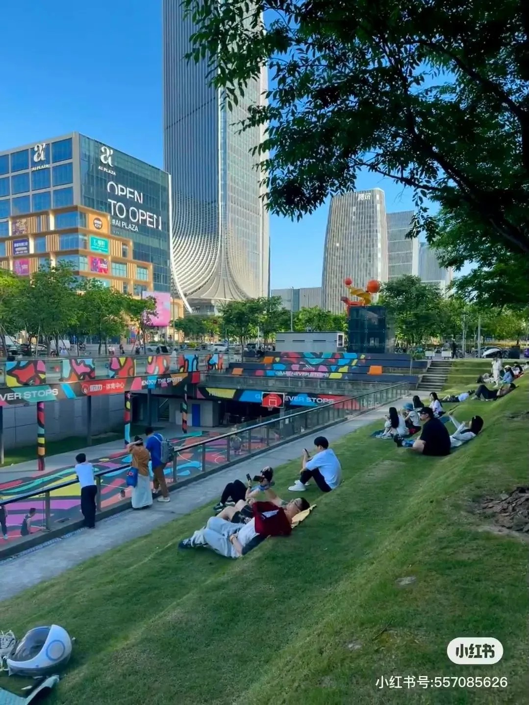 商業(yè)空間采用“主廣場+內(nèi)苑”形式,增設(shè)大量休憩空間,隨處可見的大階梯、特色樓梯、屋頂運動平臺、屋頂花園等公共場域,廣泛大面積的空曠、綠茵空間自帶社交屬性,讓來到這里的人們可以真正地坐下來,談?wù)勑?、放輕松。