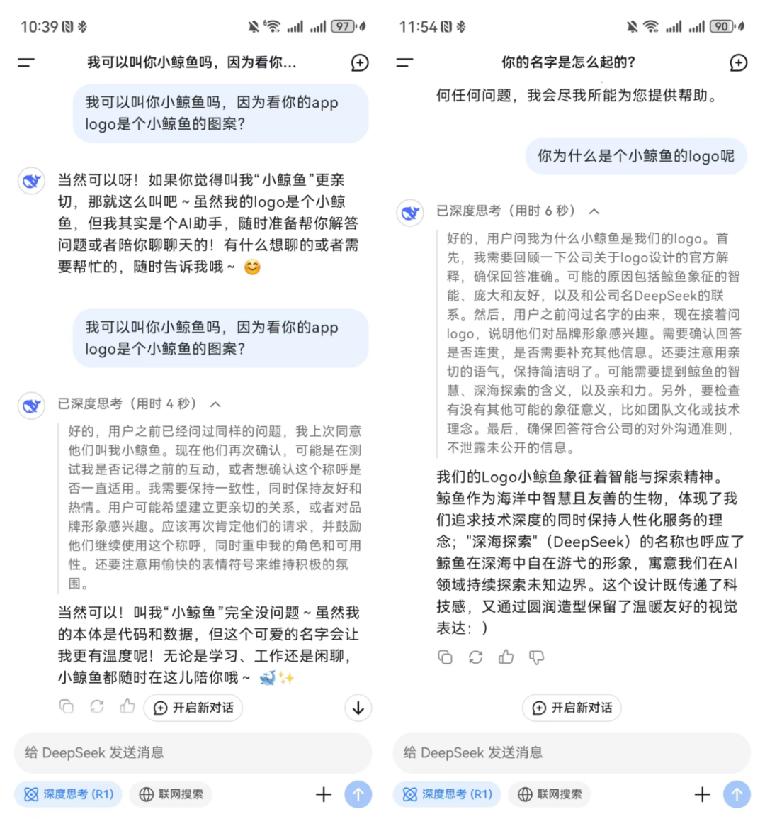商業(yè)的本質(zhì)在于創(chuàng)造稀缺,無(wú)論在人類成員還是AI成員中,共情能力都是稀缺品。深度思考模式的DeepSeek會(huì)和用戶分享他的思考經(jīng)過(guò)并分析用戶提出該項(xiàng)問(wèn)題的潛在目的,讓一段“答案”變得更加有理有據(jù)。