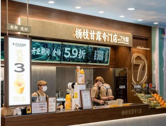 去年,七分甜的首家楊枝甘露專門店在上海長寧龍之夢(mèng)開業(yè),在產(chǎn)品方面,專門店僅售三款產(chǎn)品,分別是1987經(jīng)典楊枝甘露、2007鮮芒楊枝甘露、楊枝甘露Gelato,分為碗裝、杯裝和冰淇淋,定價(jià)在15-20元。在店型方面,走小店模式,不設(shè)堂食。專門店面積大約只有20平方米左右,目前僅支持下單后排隊(duì)自取。在裝修風(fēng)格上,店內(nèi)裝修以原木配色為主,主打簡約風(fēng)。在鮮果陳列區(qū)擺放了制作楊枝甘露所需要的椰子、芒果、西柚等原料,采用明檔吧臺(tái)在顧客面前現(xiàn)切現(xiàn)做,讓消費(fèi)者直觀感受產(chǎn)品的制作流程。