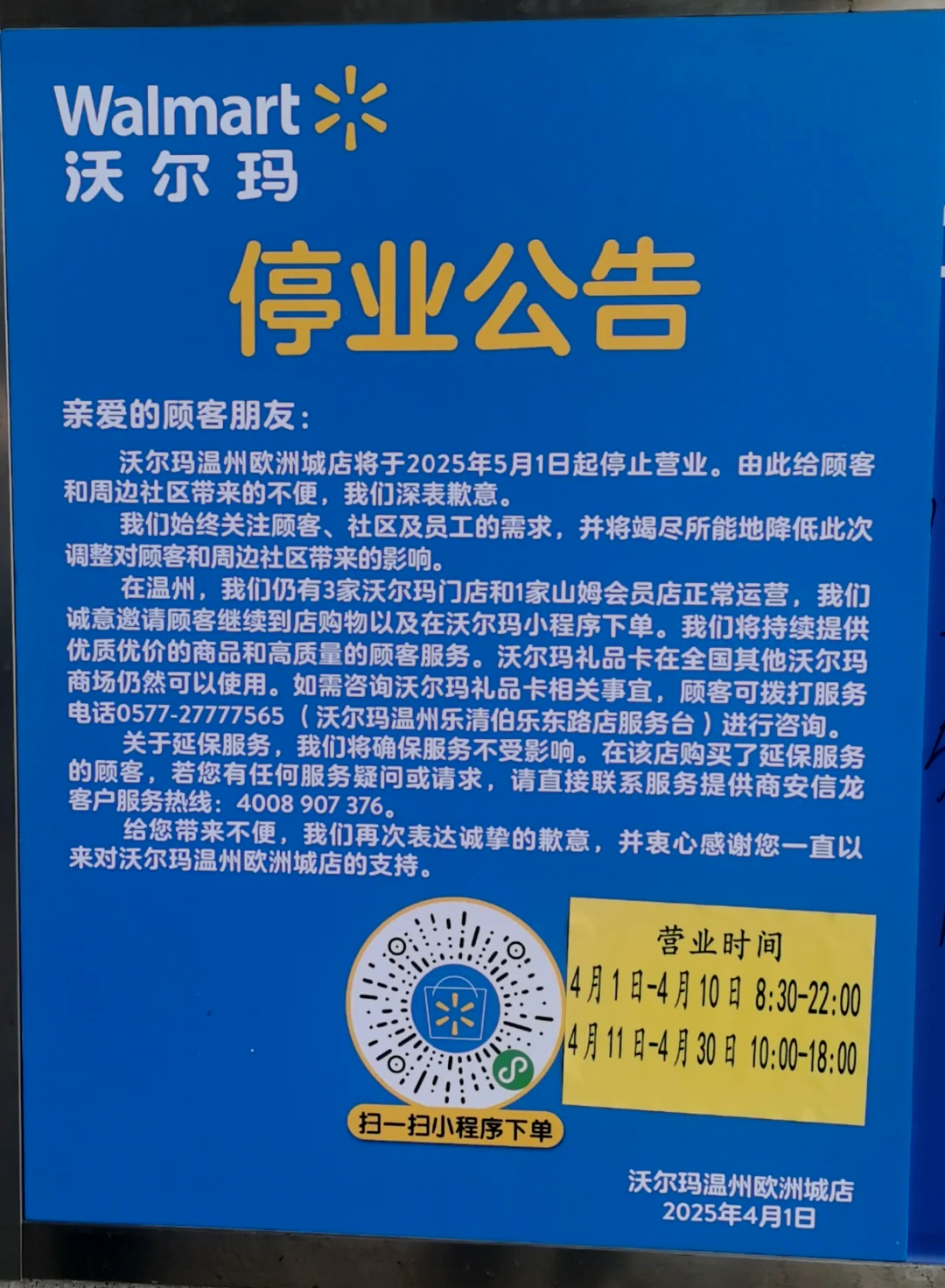行至2025年,除了如胖東來(lái)、山姆等商超企業(yè),超市行業(yè)的生意依然難做。4月1日,沃爾瑪溫州市區(qū)最后一家門(mén)店宣布將于5月1日停業(yè),該店是繼沃爾瑪東海店、沃爾瑪鴻瑛店之后,溫州市區(qū)營(yíng)業(yè)的唯一一家實(shí)體店。在關(guān)閉門(mén)店的公告中,沃爾瑪明確表示,關(guān)店原因主要?dú)w結(jié)為戰(zhàn)略調(diào)整以及合同或租約到期。其中廣州新港店,由于所在商城整體改造升級(jí),預(yù)計(jì)今年10月將重新開(kāi)業(yè)。
